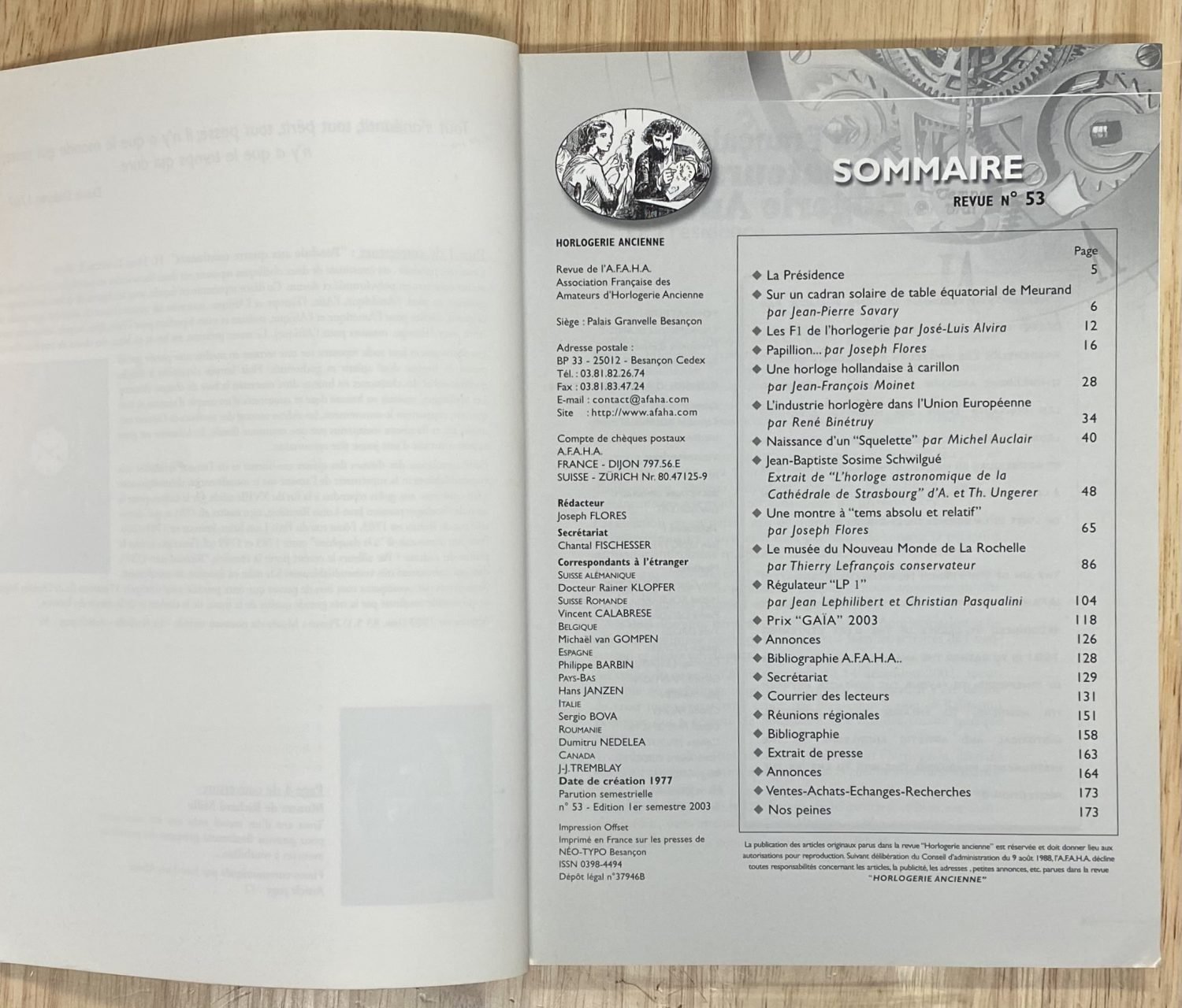 Revue de l’AFAHA horlogerie ancienne N°53, en assez bon état. Michel Auclair vous partage les différentes étapes de la réalisation de son horloge squelette.