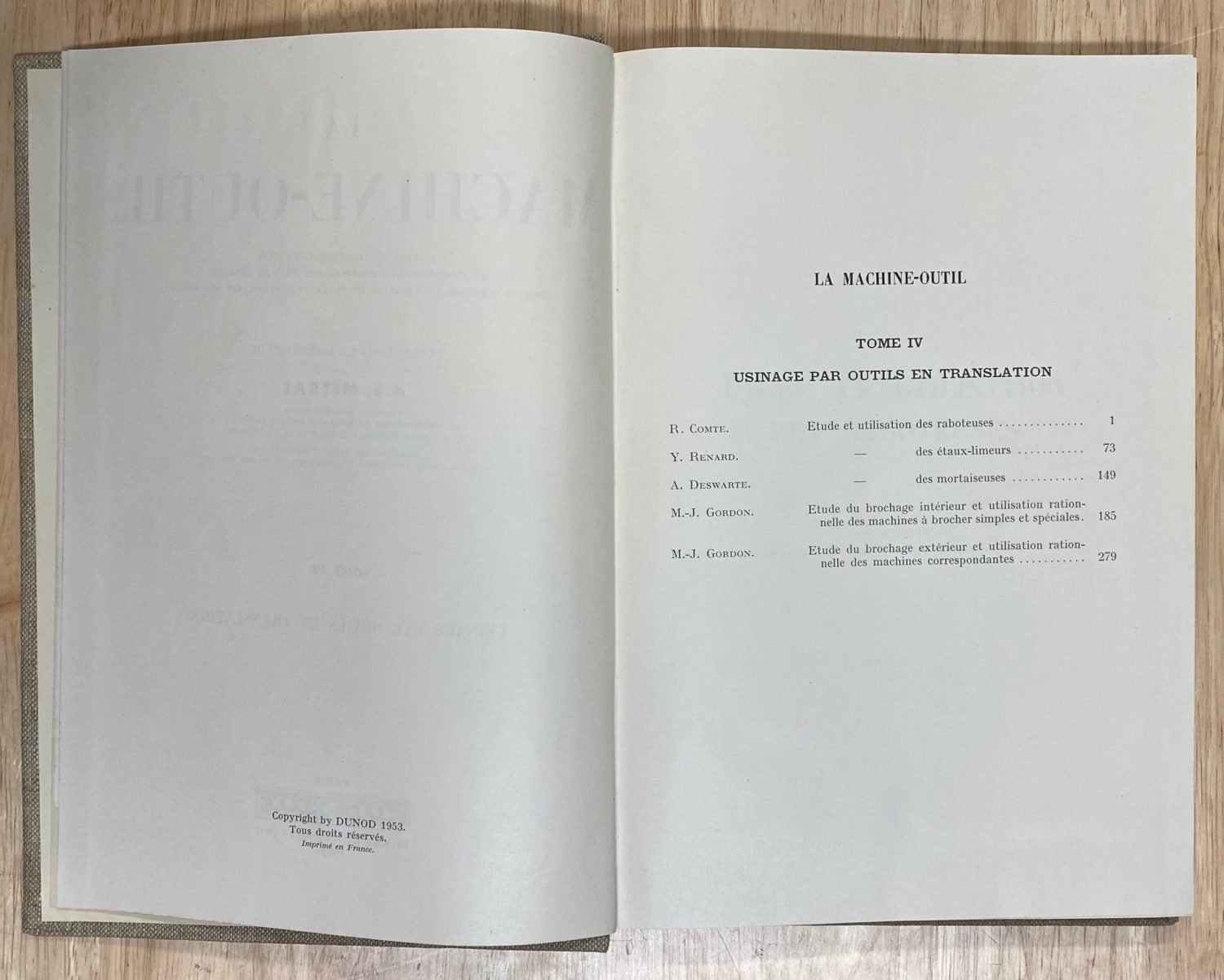 La machine-outil, tome IV, usinage par outils en translation, en bon état hormis un petit morceau d’une page blanche déchiré.