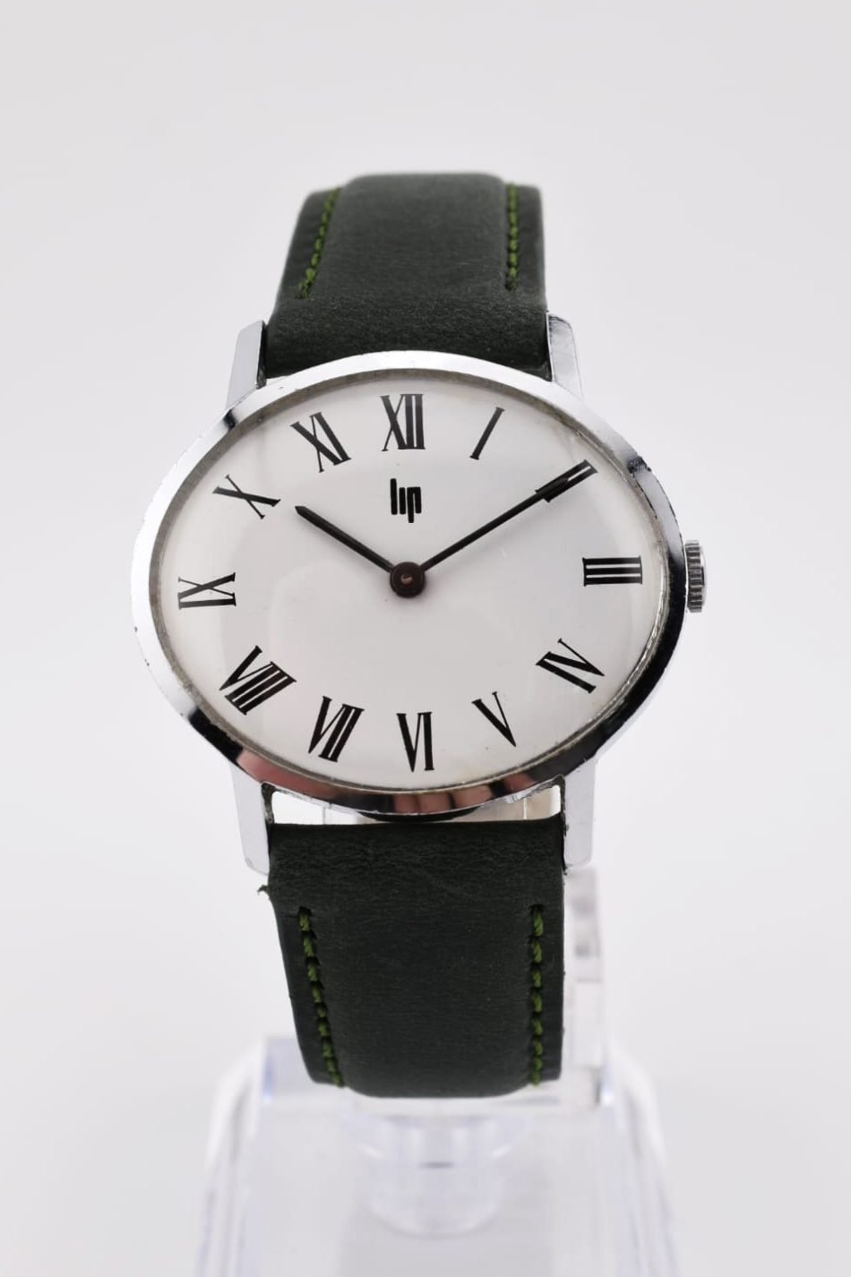 Montre Lip vintage pour femme datant des années 70 avec boîte chromée de forme ovale au design typique de l’époque.
